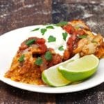 Once cornbread is done baking, reduce oven to 350 degree F. Poke holes in cornbread with a fork and pour enchilada sauce over it. Top with chicken and then top with shredded cheese. Cover with aluminum foil. Bake in oven for 20 minutes. Remove foil and back until cheese begins to brown, about 5-10 minutes.